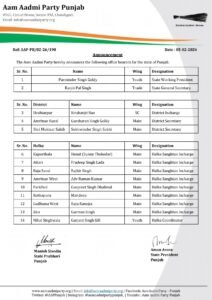 आम आदमी पार्टी पंजाब ने राज्य, जिला और विधानसभा क्षेत्र स्तर पर संगठन को मजबूत करने के लिए महत्वपूर्ण नियुक्तियों की घोषणा की है। पार्टी का कहना है कि इन फैसलों से जमीनी स्तर पर संगठन को मजबूती मिलेगी और कार्यकर्ताओं के बीच बेहतर तालमेल बनेगा।