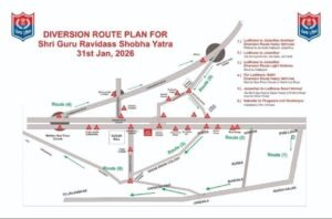 श्री गुरु रविदास महाराज़ जी की शोभा यात्रा के आयोजन को देखते हुए 31 जनवरी 2026 को लुधियाना, जालंधर और आसपास के इलाकों में ट्रैफिक व्यवस्था में बदलाव किया गया है। पंजाब पुलिस ने श्रद्धालुओं की सुरक्षा और यातायात को सुचारु बनाए रखने के लिए रूट डायवर्जन प्लान जारी किया है। इस दौरान कई मुख्य मार्गों पर वाहनों की आवाजाही बदले गए रास्तों से करवाई जाएगी।